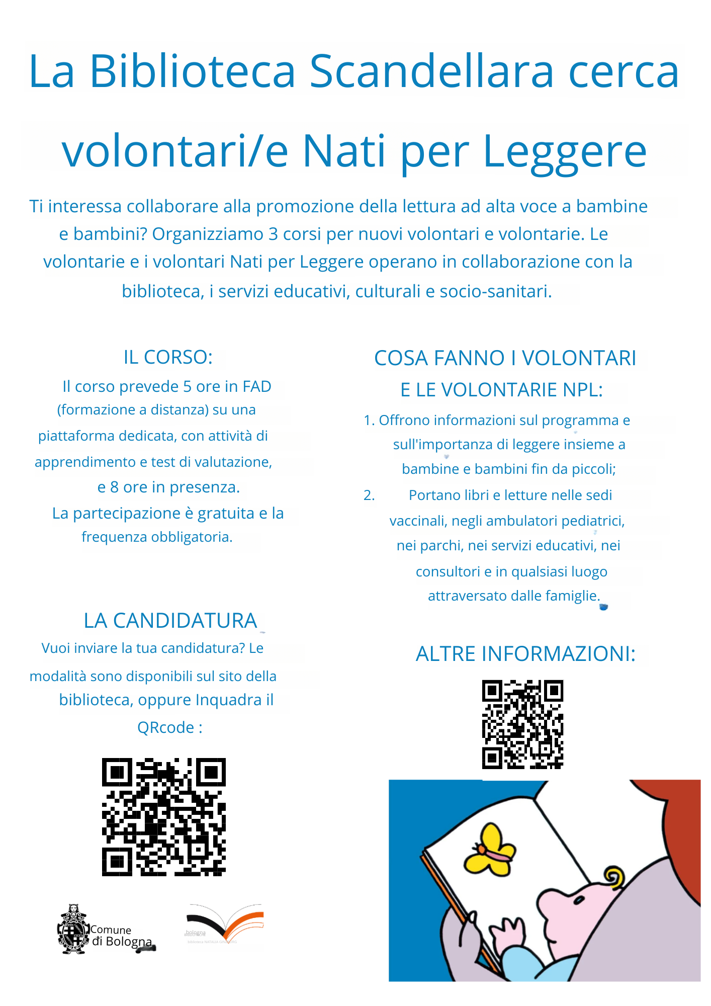 La Biblioteca Scandellara - Mirella Bartolotti cerca volontarie e volontari Nati per Leggere e insieme alle altre Biblioteche di Pubblica Lettura del Comune di Bologna che aderiscono al programma Nati per Leggere organizza 3 corsi multidisciplinari per nuovi volontari e operatori dei servizi educativi, culturali e socio-sanitari.
