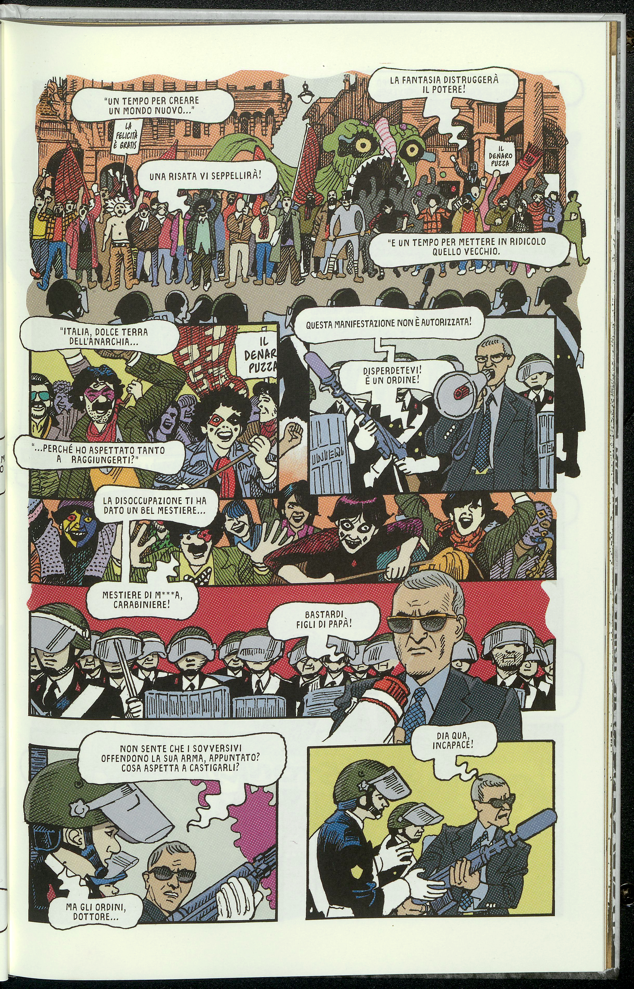 Ancora una tavola dal fumetto sceneggiato da Brizzi e disegnato da Bacilieri. Siamo nei momenti che precedono uno scontro di piazza e la sceneggiatura sceglie di porre in primo piano il linguaggio tipico di quegli anni e di quelle situazioni: una serie di slogan vengono urlati dai manifestanti. Quegli slogan esprimono il pensiero del Movimento in maniera sintetica e sono ormai entrati nell’immaginario comune. La più volte citata conversazione di Benni con Stefano Tani contenuta in Scrittori a Verona, è in realtà un dialogo a più voci dal momento che lo scrittore, oltre che alle domande di Tani, risponde anche a quelle di un gruppo di studenti. In due occasioni gli viene chiesto un commento su due degli slogan più famosi: «l’immaginazione al potere» (p. 52) e «una risata vi seppellierà» (p. 60). Un segnale che anche nei più giovani è radicata l’idea che quel tipo di linguaggio era tipico di quel periodo e di quella forma di protesta.