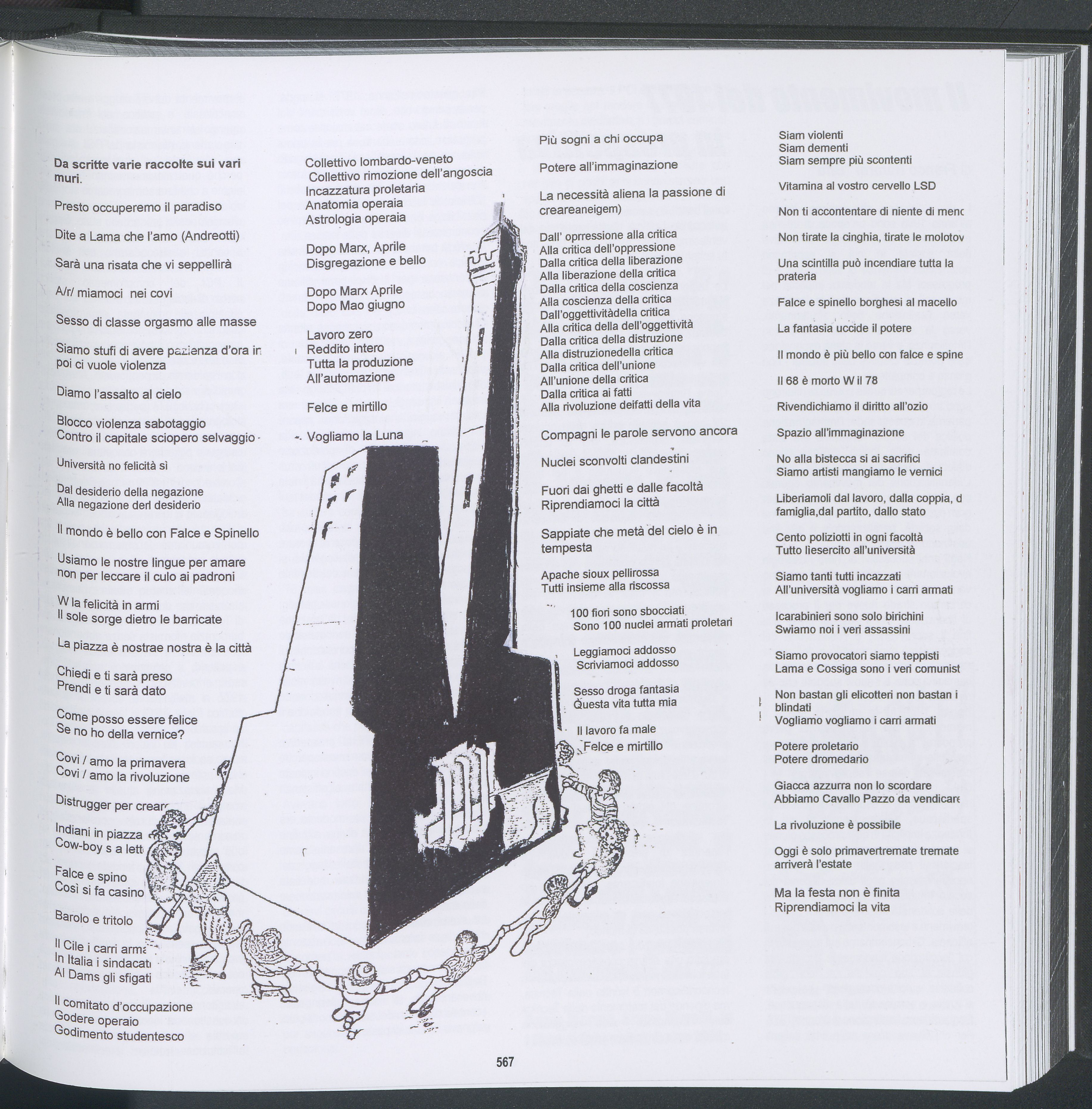 Anche il citato libro di Ignazio Maria Gallino, 1965-1985. Vent’anni di controcultura, dedica una pagina - al centro della quale campeggiano le due torri bolognesi - agli slogan che, oltre a essere urlati durante le manifestazioni, venivano scritti sui muri. Il fumetto su Joker è costellato di piccole scritte sui muri, quasi per invitare il lettore a cercarle e riconoscerle.