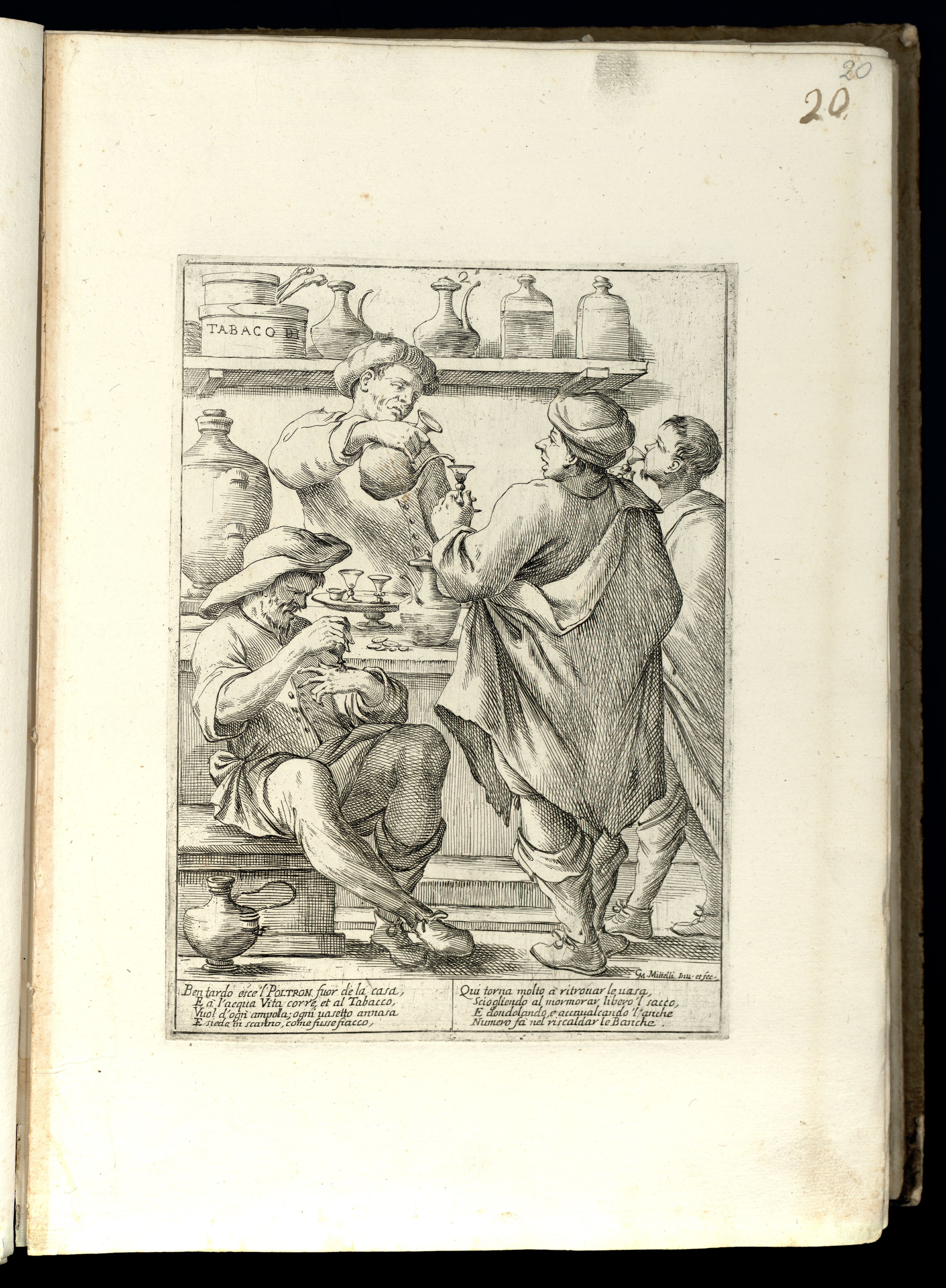 Tutte le incisioni sono accompagnate da un’ottava. Nella seconda immagine della serie, qui riprodotta, si legge: «Ben tardo esce ’l Poltron fuor de la casa | E à l’acqua Vita corre, et al Tabacco». Mitelli sembra mettere in scena, in effetti, una tranche de vie che non sfigurerebbe in Bar Sport: in una locanda, tra bottiglie e tabacchi, un oste, serio e dall’aria scocciata, guarda lontano mentre versa da bere al «poltrone» che, nel frattempo, lo sta annoiando con le sue chiacchiere.