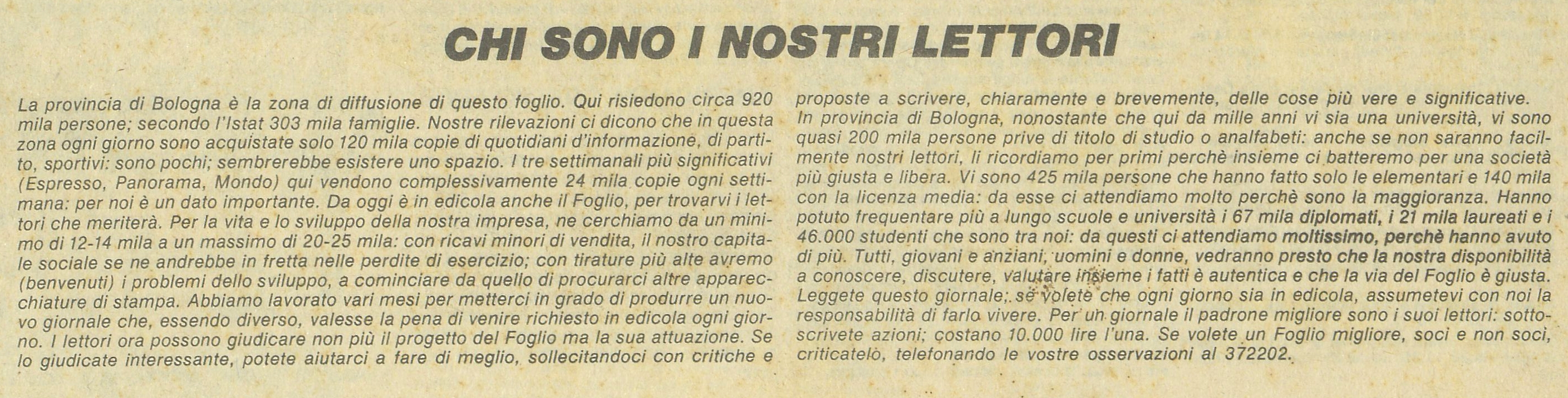«Il Foglio di Bologna» è un quotidiano che inizia le pubblicazioni il 3 giugno 1975 e che persegue lo scopo dichiarato da Fofi all’inizio della sua conversazione con Benni, cioè «l’utopia di avere dei propri media» alternativi a quelli più diffusi e che erano espressione dei diversi gruppi politici e di potere. Questo desiderio di porsi in maniera alternativa - e di raggiungere anche un pubblico diverso, con cui instaurare un dialogo collaborativo - viene dichiarata sulla prima pagina del primo numero nel breve trafiletto Chi sono i nostri lettori.