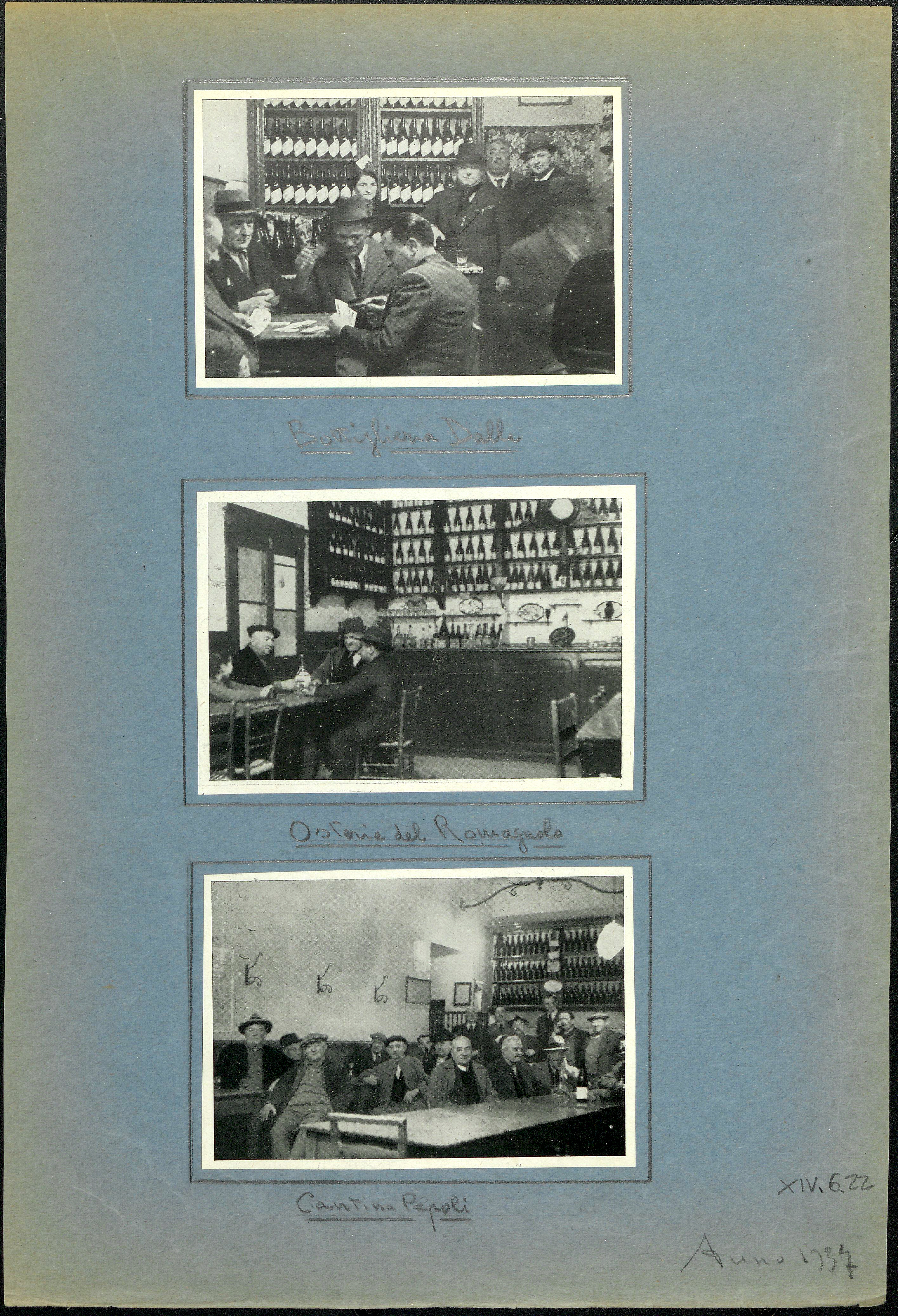 La vita a Bologna è sempre passata per i tavoli delle osterie: qui si vedono tre locali storici – la Bottiglieria Dalla, l’Osteria del Romagnolo, la Cantina de’ Pepoli – nel 1937. Nella prima immagine, l’occhio cade sui quattro avventori che, in primo piano, stanno giocando a carte. Difficile dire a cosa in particolare: forse a briscola, forse al tarocchino bolognese?